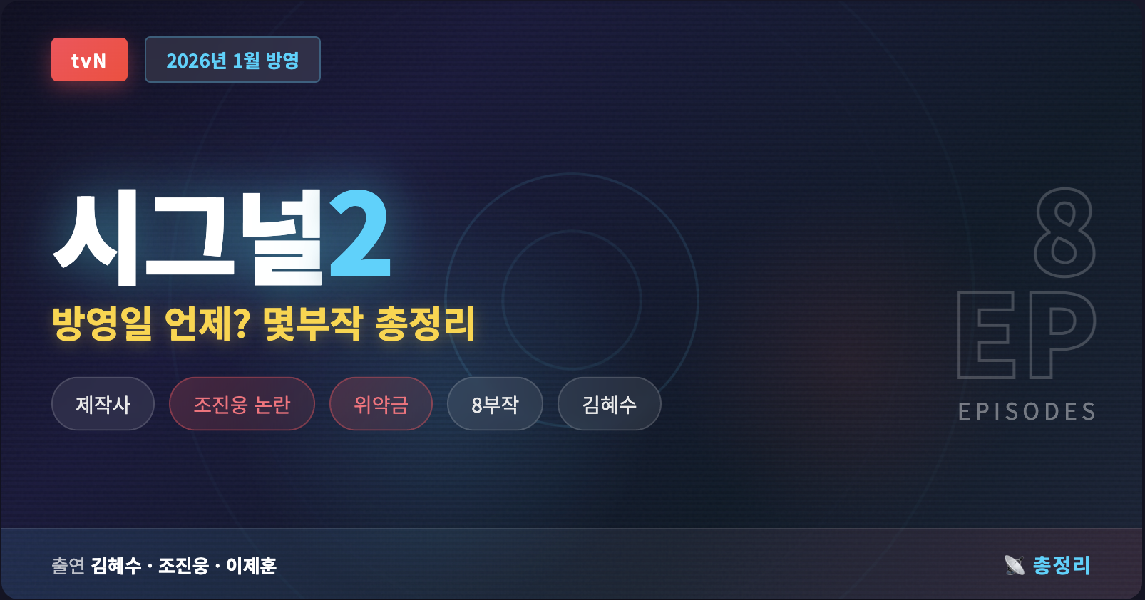 2016년 방영 당시 최고 시청률 15%를 기록하며 장르 드라마의 새 역사를 쓴 tvN 드라마 시그널이 드디어 시즌2로 돌아옵니다. 많은 분들이 시그널2 방영일이 언제인지, 몇부작인지 궁금해하실 텐데요. 결론부터 말씀드리면 시그널2는 2026년 1월 방영 예정이며 8부작으로 제작되었습니다. 다만 최근 조진웅 논란으로 인해 방영 여부가 불투명해진 상황입니다. 시그널2 제작사, 제작비, 촬영 일정, 조진웅 위약금 문제까지 모든 정보를 정리해 드리겠습니다.