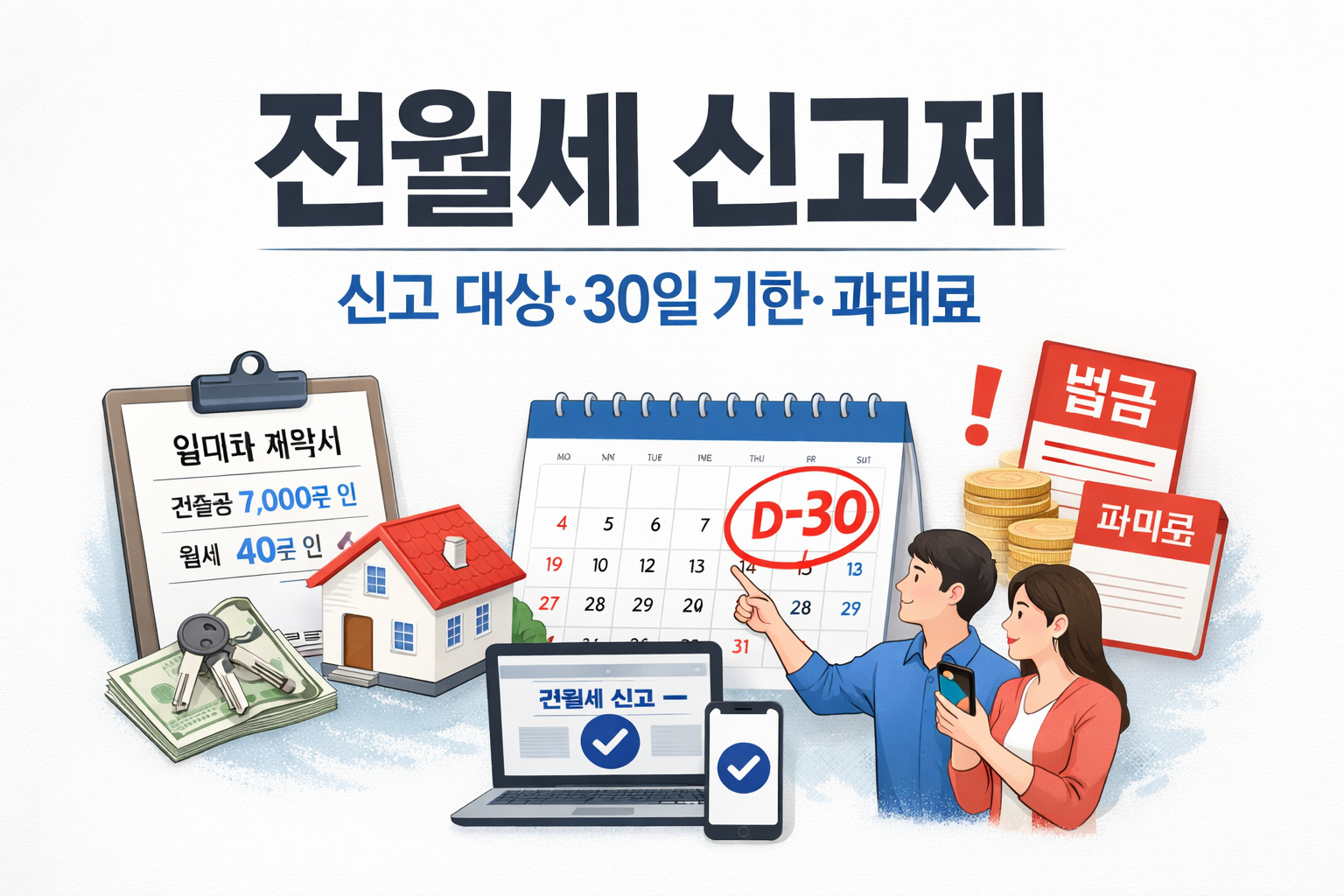전월세 신고제의 기본 원칙은 간단합니다. 임대차 계약 체결일로부터 30일 이내에 주택임대차계약 신고를 해야 합니다. “이사 날짜”가 아니라 계약일(체결일) 기준으로 움직인다는 점이 가장 많이 놓치는 부분입니다.