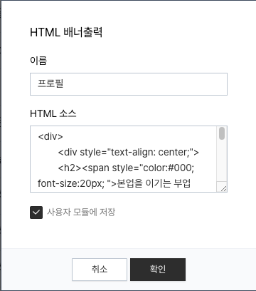7. '편집' 에서 '이름' 과 'HTML 소스' 를 넣고 확인을 누릅니다.